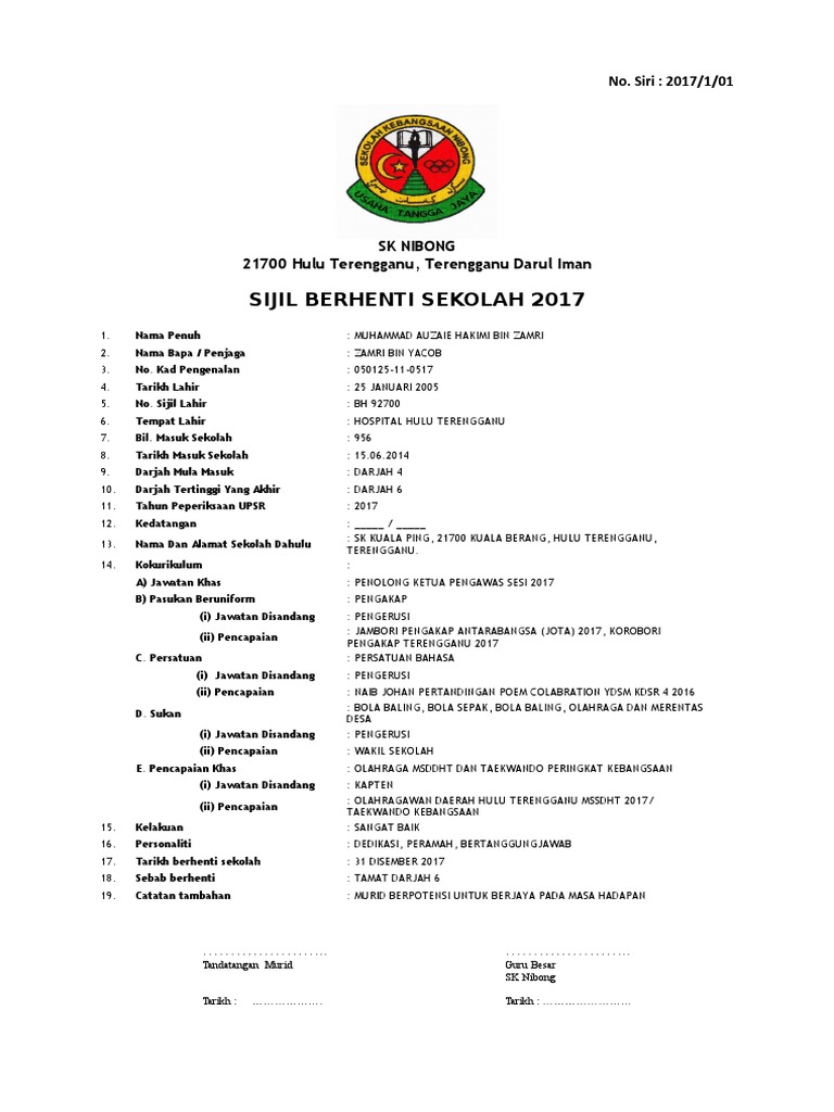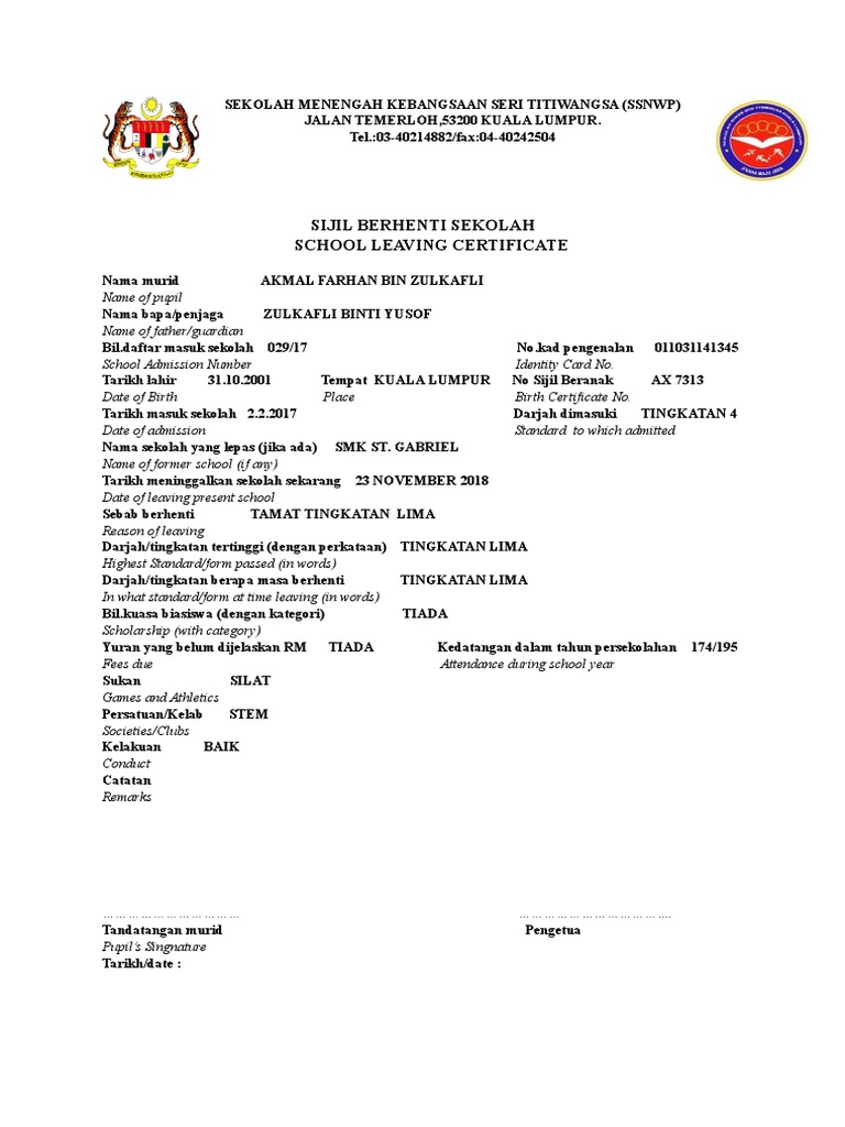 Sekolah menengah agama nilai, 71800 nilai, negeri sembilan no. Pi tarikh lahir tarikh masuk sekolah : Untuk pengetahuan kalian, sijil berhenti sekolah perlu dirujuk ke sekolah terakhir tempat anda bersekolah. Namun rencana ini akan membantu kamu buat pilihan. Home admin sekolah sijil berhenti sekolah dan sijil akuan sekolah. Membuat penempatan murid tahun 6 ke sekolah menengah berdasarkan alamat rumah , zon atau sebagainya sepertimana yang. Sijil akademik tertinggi seperti spm/stpm/diploma/ijazah/master/phd. Sijil ijazah upsi (versi bahasa melayu). Aku buat post ni sbb aku banyak terima soalan berkenaan sijil berhenti sekolah, sijil2 kokurikulum, dsb. Download draf sijil berhenti sekolah. Sekolah menengah kebangsaan tunku a. Pinang tarikh berhenti sekolah : Di as, sijil kemahiran sekolah tinggi adalah sesuatu yang dikeluarkan oleh jabatan pendidikan california kepada pelajar yang telah lulus ujian.