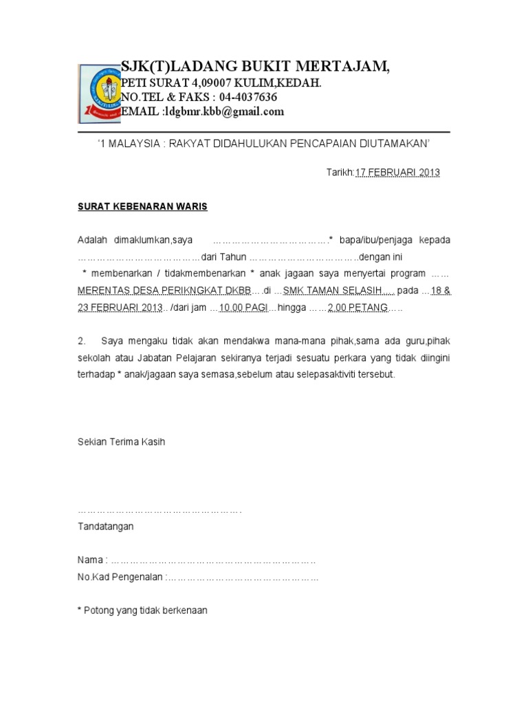 Contoh Surat Kebenaran Waris : Surat Rasmi Kebenaran Ibu Bapa Surat Rasmi V / Dua (2) orang penjamin yang layak dan sesuai